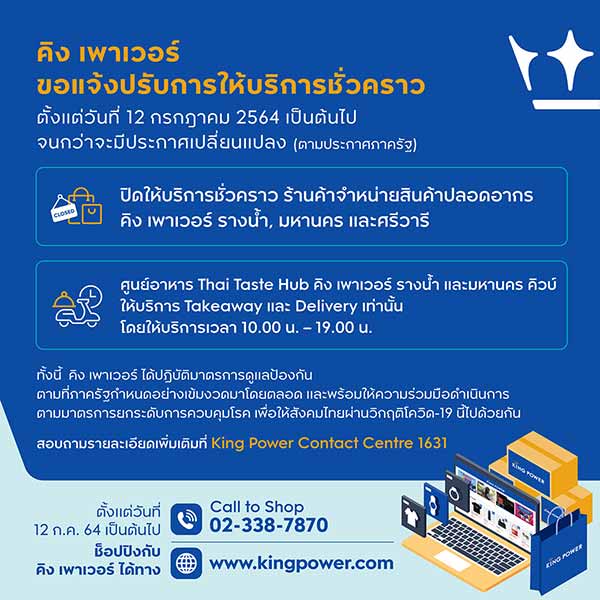 จากแนวทางการควบคุมการแพร่ระบาดของโควิด-19 ในระลอก 4 ของภาครัฐ ที่เกิดเป็นภาวะวิกฤติในพื้นที่กรุงเทพฯ และปริมณฑล เพื่อให้ความร่วมมือกับภาครัฐ ตั้งแต่วันที่ 12 กรกฎาคม นี้ คิง เพาเวอร์ จะปิดให้บริการชั่วคราวสำหรับร้านค้าจำหน่ายสินค้าปลอดอากร 3 แห่ง ได้แก่ คิง เพาเวอร์ รางน้ำ, มหานคร และศรีวารี โดยจะปรับการให้บริการรองรับการช้อปปิ้งวิถีใหม่เรียกว่า 'King Power Call to Shop ช้อปง่าย ช้อปคุ้ม ส่งไว'