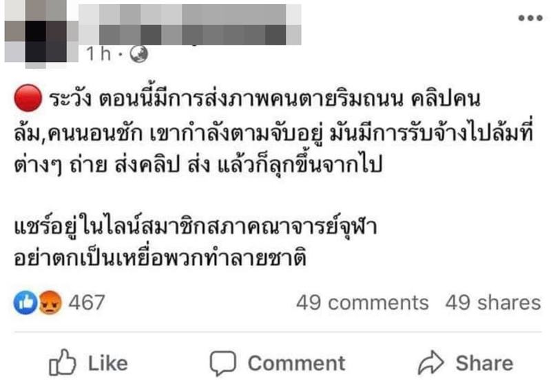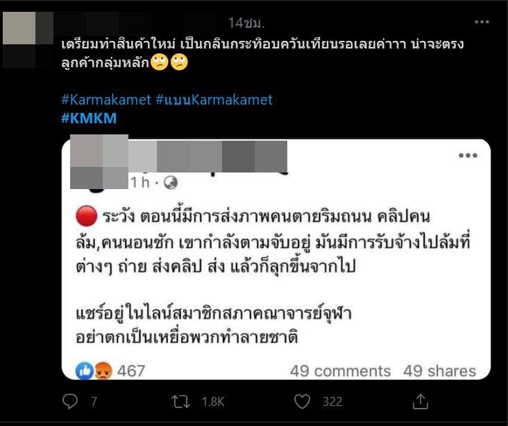 จากเรื่องนี้กลายเป็นดราม่าในโลกออนไลน์ มีคนพบว่า คุณณัธธร หุ้นส่วนแบรนด์ Karmakamet แบรนด์เครื่องหอมชื่อดัง ทำการแชร์ข้อความและภาพดังกล่าว ระบุว่า ระวัง ตอนนี้มีการส่งภาพคนตายริมถนน คลิปคนล้ม, คนนอนชัก เขากำลังตามจับอยู่ มันมีการรับจ้างไปล้มที่ต่าง ๆ ถ่าย ส่งคลิป ส่งแล้วก็ลุกเดินจากไป อ้างว่าภาพนั้นถูกแชร์อยู่ในไลน์อาจารย์มหาวิทยาลัยชื่อดัง อย่าตกเป็นเหยื่อพวกทำลายชาติ