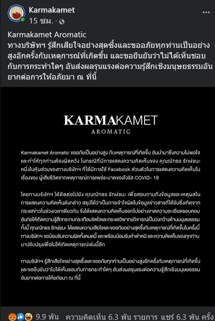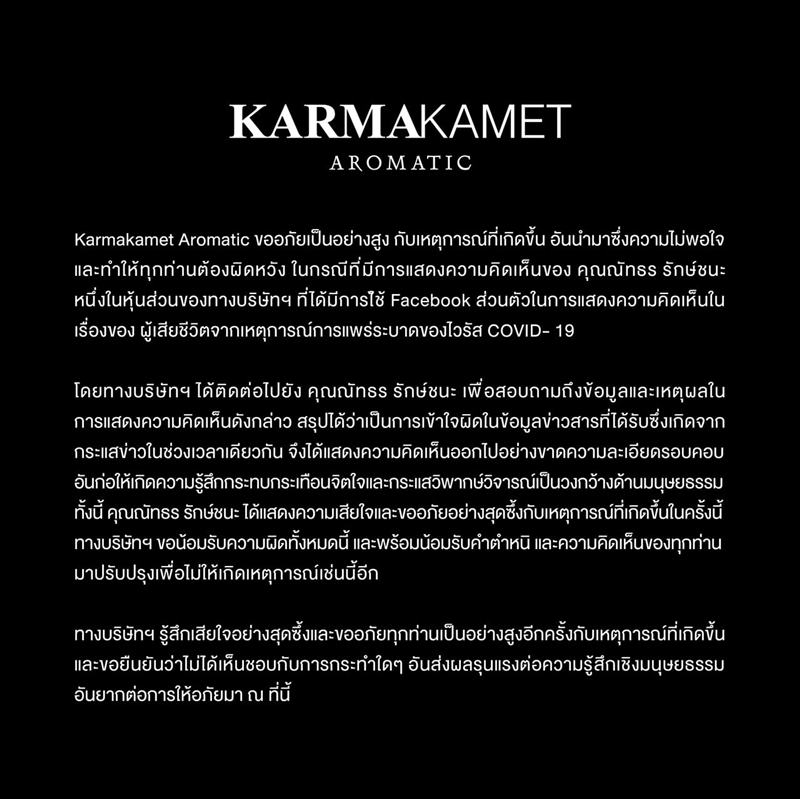 เรื่องนี้กลายเป็นกระแสแรงมาก อันเนื่องจากช่วงนี้ Work From Home และกระแสเทียนหอม เครื่องหอมก็มาแรง ช่วยให้ผ่อนคลาย หากปล่อยไว้อาจจะส่งผลต่อยอดขาย ทำให้แบรนด์ Karmakamet ได้ออกมาแถลงผ่านเฟซบุ๊ก Karmakamet Aromatic ได้ออกแถลงการณ์ขออภัยกับเรื่องที่เกิดขึ้น และได้มีการสอบถามไปยังหุ้นส่วนคนนั้นและได้ความว่า เป็นการเข้าใจผิดในข้อมูลข่าวสารที่ได้รับซึ่งเกิดจาก กระแสข่าวในช่วงเวลาเดียวกัน จึงได้แสดงความคิดเห็นออกไปอย่างขาดความละเอียดรอบคอบ อันก่อให้เกิดความรู้สึกกระทบกระเทือนจิตใจและกระแสวิพากษ์วิจารณ์เป็นวงกว้างด้านมนุษยธรรม ทางบริษัทก็พร้อมน้อมรับผิด คำตำหนิ และทุกความเห็นเพื่อไม่ให้เกิดเหตุการณ์เช่นนี้อีก