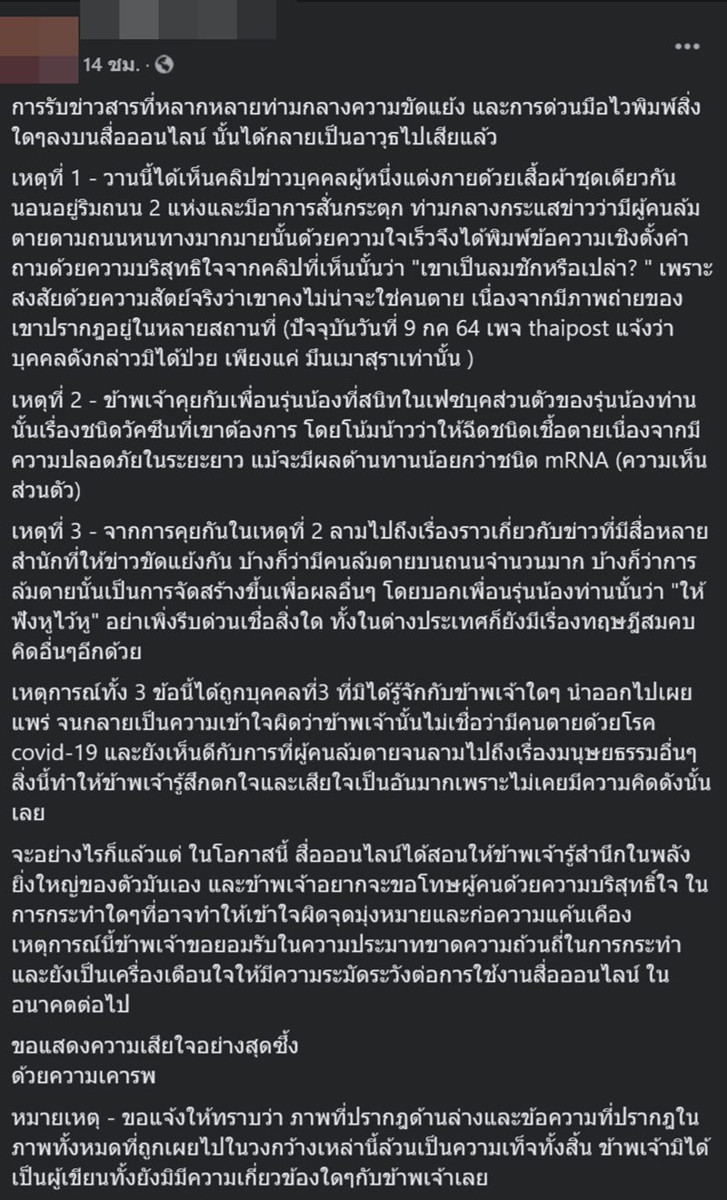 ทั้งนี้มีบุคคลที่ 3 ที่ไม่ได้รู้จักกัน นำเรื่องนี้ออกไปเผยแพร่จนกลายเป็นความเข้าใจผิดว่าตนนั้นไม่เชื่อว่ามีคนตายด้วยโรคโควิด และยังเห็นดีกับการที่ผู้คนล้มตายจนลามไปถึงเรื่องมนุษยธรรมอื่น ๆ สิ่งนี้ทำให้รู้สึกตกใจและเสียใจเป็นอันมาก เพราะไม่เคยมีความคิดดังนั้นเลย อย่างไรก็ดี ในโอกาสนี้สอนให้รู้สำนึกในพลังของสื่อออนไลน์ และอยากจะขอโทษผู้คนด้วยความบริสุทธิ์ใจ ในการกระทำใด ๆ ที่อาจทำให้เข้าใจผิดจุดมุ่งหมายและก่อความแค้นเคือง เหตุการณ์นี้ตนขอยอมรับในความประมาทขาดความถ้วนถี่ในการกระทำ และยังเป็นเครื่องเตือนใจให้มีความระมัดระวังต่อการใช้งานสื่อออนไลน์ ในอนาคตต่อไป ขอแสดงความเสียใจอย่างสุดซึ้ง พร้อมยืนยันว่าภาพข่าวเรื่องผู้เสียชีวิตที่มีการแชร์นั้นเป็นความเท็จทั้งสิ้น ซึ่งตนไม่ได้เป็นผู้เขียนหรือมีความเกี่ยวข้องใด ๆ