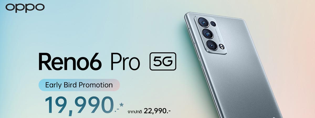 26 สิงหาคม 2564 – OPPO แบรนด์สมาร์ทโฟนชั้นนำในไทย เปิดตัว OPPO Reno6 Pro 5G อย่างเป็นทางการผ่าน OPPO Reno6 Pro 5G UNBOX LIVESTREAMING มอบประสบการณ์ความเร็วแรงในระดับแฟล็กชิพ พร้อมให้คุณสัมผัสทุกช่วงอารมณ์ความรู้สึกด้วยภาพและวิดีโอพอร์ตเทรตที่สวยงามกว่าใคร โดยจะวางจำหน่ายบนช่องทางออนไลน์ (Online Exclusive) ในราคาเพียง 22,990 บาท
