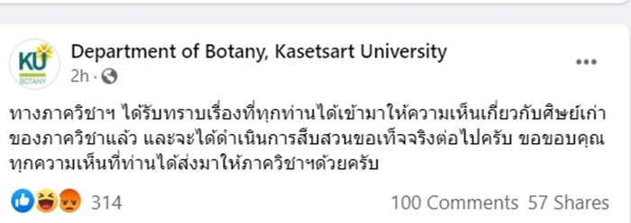 ภาควิชาพฤกษศาสตร์ มหาวิทยาลัยเกษตรศาสตร์ เตรียมพิจารณา ดร. ที่เป็นแอดมินกรุ๊ปคนรักบุฟเฟ่ต์ หลังไปขู่ทางร้านว่าไม่ให้กินฟรี ไม่มีรีวิว และจะแบนห้ามพูดถึงร้านในกรุ๊ป ล่าสุดทางคณะฯ เตรียมพิจารณา ดร. คนนี้ อนาคตอาจดับเพราะความอยากกินบุฟเฟ่ต์ฟรี