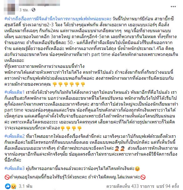 สาวโพสต์ฉะคู่รักกินบุฟเฟ่ต์บาร์บีคิว พลาซ่า สั่งไม่ยั้งทั้งที่ร้านบอกว่าถ้าเหลือจะปรับ สุดท้ายเหลือเป็นกิโลฯ ก่อนเช็กบิลแล้วชิ่งหนี หวั่นพนักงานโดนหักเงินเดือนจ่ายส่วนต่างค่าของเหลือ ด้านผู้บริหารบาร์บีคิว พลาซ่า ทราบเรื่องแล้ว