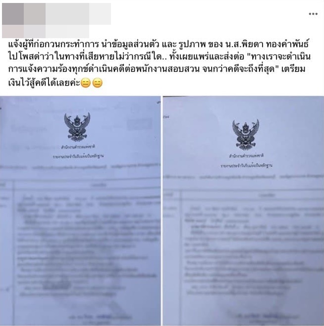 ทั้งนี้ หากเหยื่อพยายามใช้กฎหมายเพื่อตามจับ น.ส.พิยดา เธอก็จะไปแจ้งความกลับเหมือนกัน ซึ่งในเฟซบุ๊กของเธอนั้น มีภาพลงบันทึกประจำวันแจ้งความเหยื่อคืน หากการกระทำของเหยื่อทำให้เกิดความเสียหาย เอาภาพไปใช้ไม่ว่าจะเป็นกรณีใด ๆ ซึ่งเธอขู่ว่าจะดำเนินการร้องทุกข์อย่างถึงที่สุด ให้เตรียมเงินสู้คดีไว้เลย