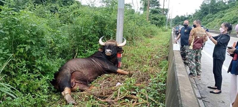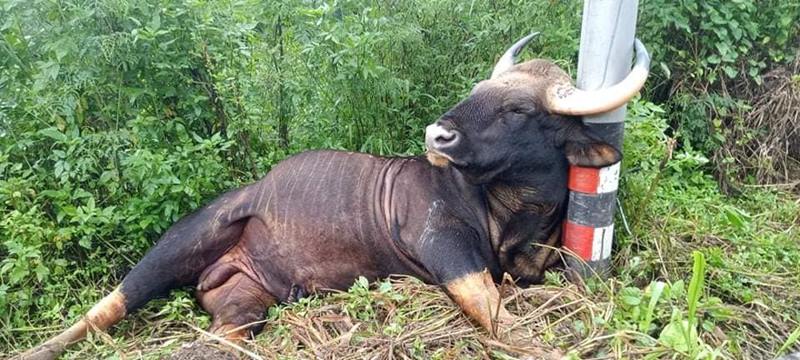 กระทิง นอนพิงเสาไฟฟ้าข้างถนน ในอุทยานแห่งชาติเขาใหญ่ เหมือนโผล่มานอนชิล ๆ แต่แท้จริงมันตายแล้ว…..
