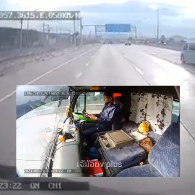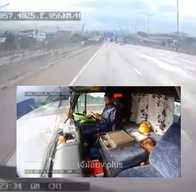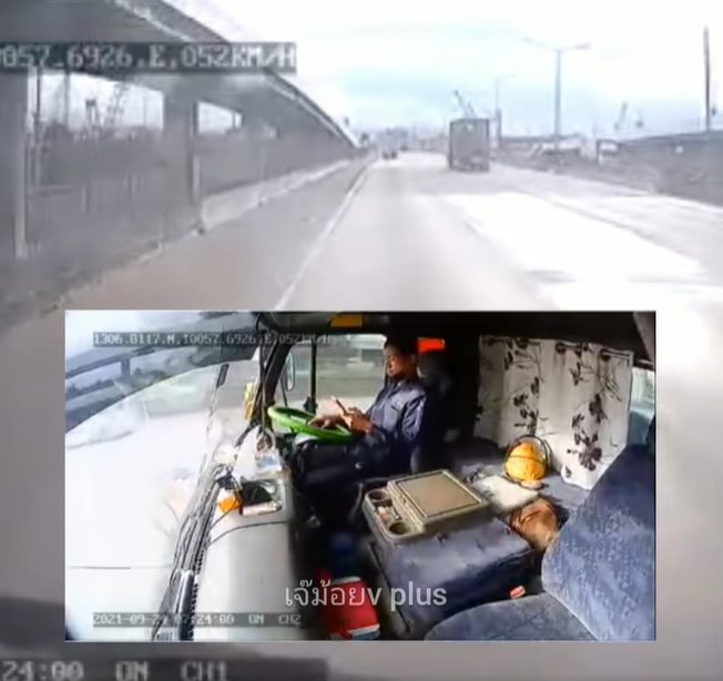 จากกล้องหน้ารถ จะเห็นได้ชัดว่า รถคันนี้ขับอยู่บนทางด่วน ถนนโล่งมาก เมื่อตัดภาพมาดูกล้องในรถ ก็เห็นว่า คนขับรถมีการใช้โทรศัพท์มือถืออยู่ โดยที่ตามองจอ มือข้างหนึ่งจับมือถือ มืออีกข้างจับพวงมาลัย ดูแล้วก็ไม่น่าจะเกิดอุบัติเหตุได้