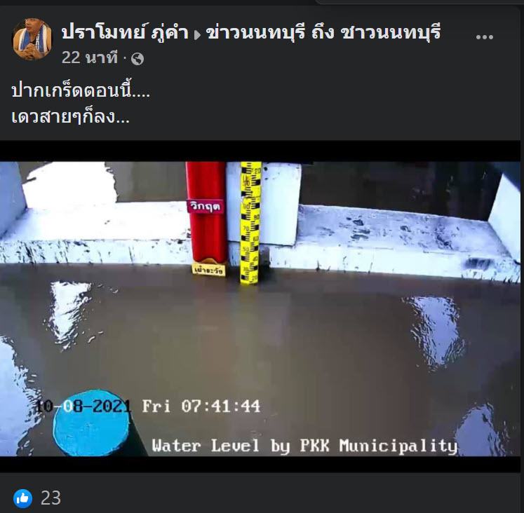 วันที่ 8 ตุลาคม 2564 เฟซบุ๊กเรื่องเล่าเช้านี้ รายงานสถานการณ์วานนี้ (7 ตุลาคม) น้ำจากแม่น้ำเจ้าพระยา ที่จังหวัดนนทบุรี ไหลทะลักเข้าท่วมพื้นที่ริมน้ำ อย่างเช่นที่เกาะเกร็ด น้ำเอ่อเข้าท่วมพื้นที่เกาะเกร็ด ทั้งบ้านเรือน และร้านอาหาร ประชาชนต่างเก็บของขึ้นที่สูง โรงงานกระถางต้นไม้ที่เลิกกิจการ น้ำท่วมในโรงงานสูง 40 เซนติเมตร