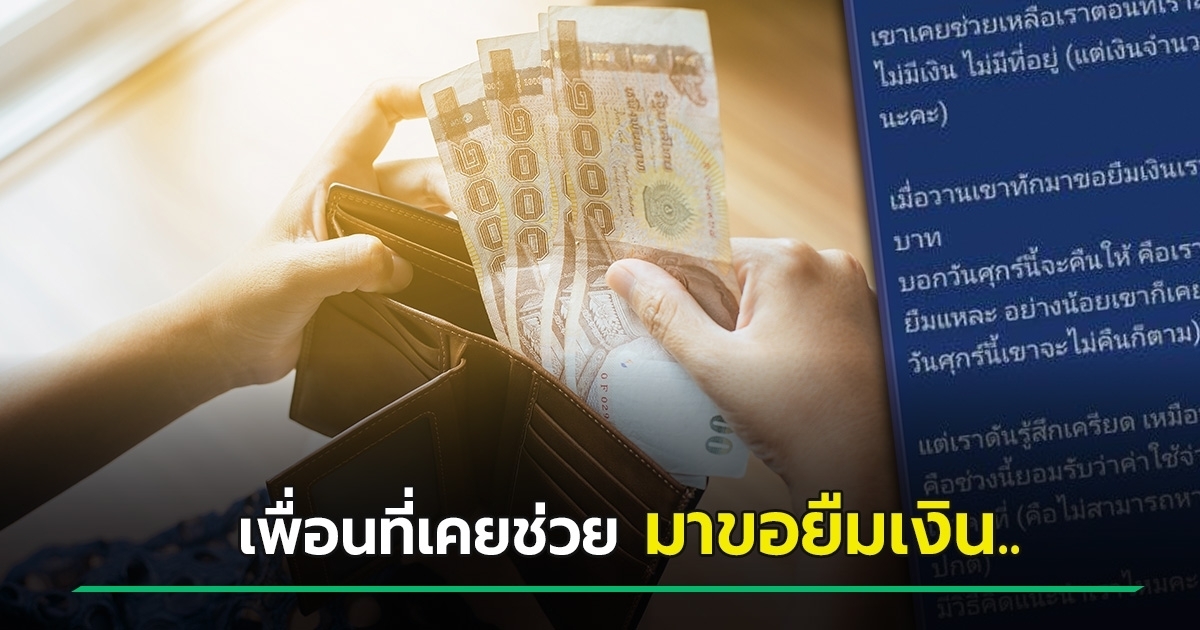 สาวตั้งกระทู้ถาม เพื่อนที่เคยช่วยมาขอยืมเงิน ต้องให้ยืมถูกไหม เผยเพื่อนเคยช่วยเพราะเคยโดนกระชากกระเป๋า แต่ลำบากใจที่จะให้ยืมเพราะตัวเองเดือดร้อน ด้านคอมเมนต์แนะนำเพียบ