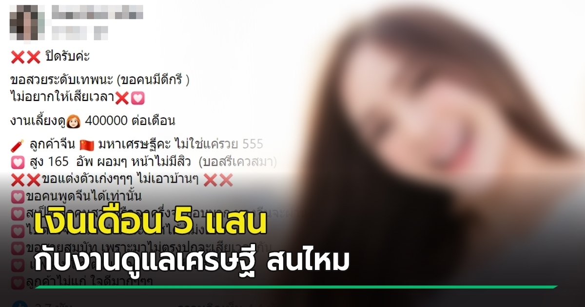 เปิดโพสต์รับสมัครสาวสวยขอคนสวยจริงตรงปก รับงานดูแลมหาเศรษฐีชาวจีน เน้นหน้าไร้สิว ไม่เอาบ้าน ๆ งานนี้สนนราคา 5 แสนบาทต่อเดือน สาว ๆ สนใจมั้ย...