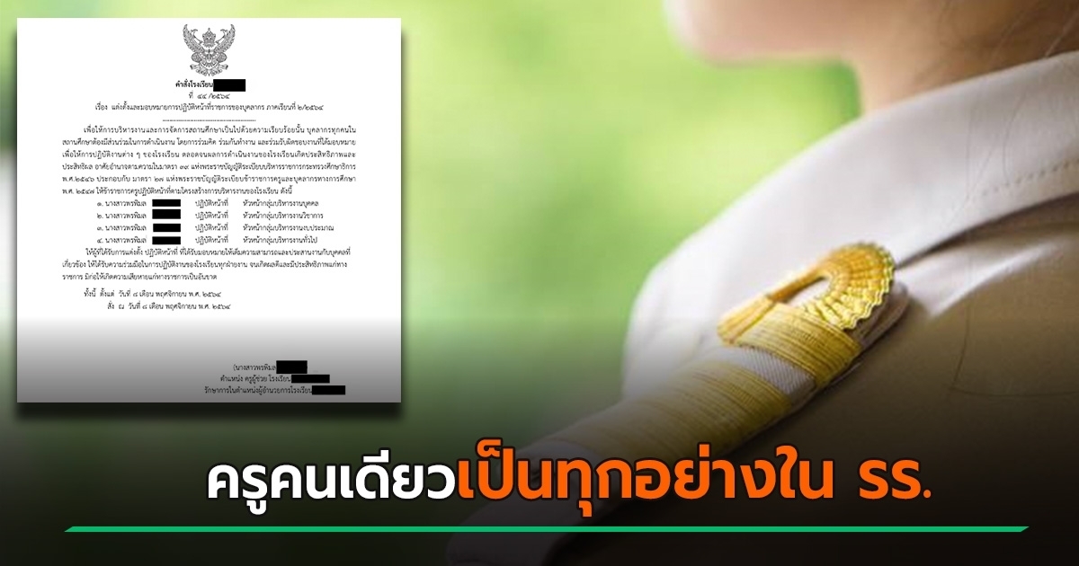 โซเชียลแชร์สนั่น เอกสารแต่งตั้งและมอบหมายการปฏิบัติหน้าที่ราชการของบุคลากร พบครูผู้ช่วย คนเดียวควบ 4 ตำแหน่งหัวหน้ากลุ่ม และยังเป็นรักษาการรักษาการผู้อำนวยการโรงเรียนด้วย