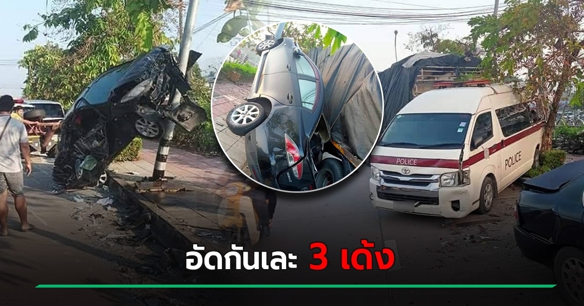 เกิดอุบัติเหตุสยอง รถเก๋ง - รถตู้ตำรวจ - รถบรรทุก อัดกันเละติดเสาไฟ จนรถเก๋งโดนอัดล้อชี้ฟ้า พังยับเยิน เร่งหาสาเหตุเกิดจากอะไรแน่