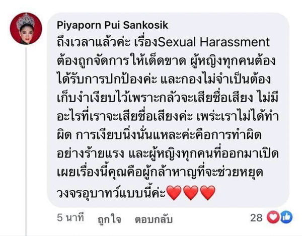 ด้าน ปุ้ย ปิยาภรณ์ แสนโกศิก ผู้อำนวยการกองประกวด มีการโพสต์เฟซบุ๊กถึงกรณีนี้อีกด้วยว่า ถึงเวลาแล้วที่ Sexual Harassment ต้องถูกจัดการให้เด็ดขาด ผู้หญิงทุกคนควรได้รับการปกป้อง และไม่ควรเก็บงำเอาไว้เพราะกลัวเสียชื่อเสียง