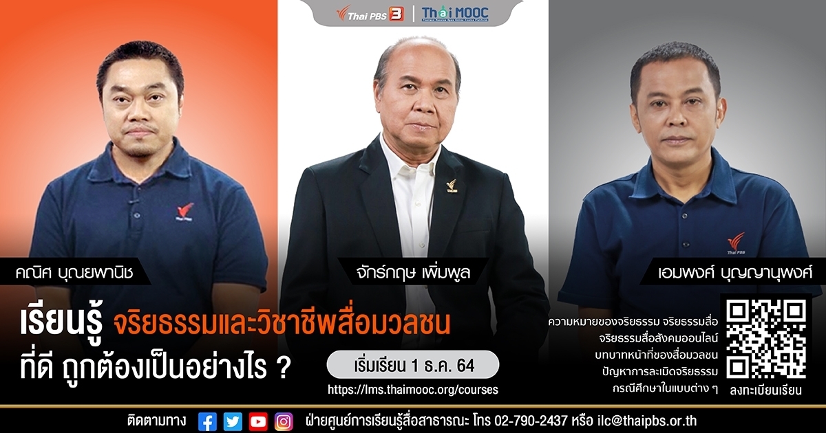 Thai PBS MOOC ชวนเพื่อนมาลงทะเบียนเรียนฟรี เริ่ม 1 ธันวาคม 2564 สามารถลงทะเบียนเรียนได้ที่ https://bit.ly/3co3dFb หรือค้นหาชื่อวิชา "จริยธรรมและวิชาชีพสื่อมวลชน" ในเว็บไซต์ https://lms.thaimooc.org/courses