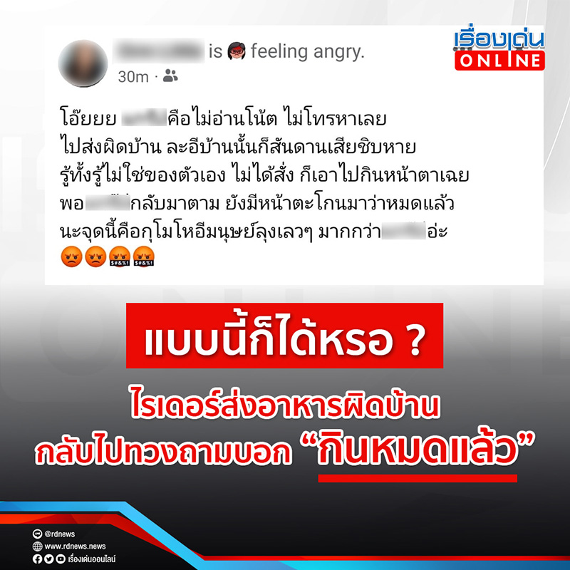 วันที่ 30 พฤศจิกายน 2564 เรื่องเด่นออนไลน์ เผยโพสต์ของสาวผู้ใช้เฟซบุ๊กรายหนึ่ง ที่โพสต์โวยเหตุการณ์ที่เกิดขึ้น หลังจากสั่งอาหารจากแอปพลิเคชันชื่อดัง เมื่อไรเดอร์มาส่งอาหาร กลับไม่อ่านโน้ต ไม่โทร. หาผู้สั่งอาหาร จนทำให้ไปส่งผิดบ้าน อาหารไปลงที่บ้านอื่นแทน