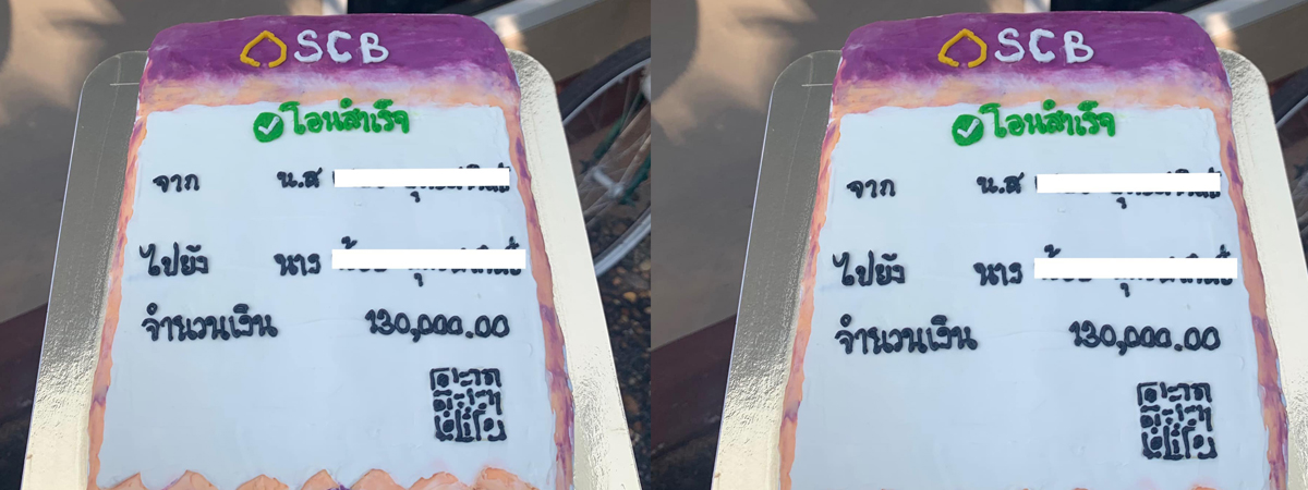 เฟซบุ๊ก Thitiporn Jundabut ได้โพสต์ภาพในกลุ่ม เบเกอรี่พอเพียง ที่ชาวเน็ตกำลังให้ความสนใจเป็นจำนวนมาก เมื่อมีลูกค้าสั่งทำเค้กหน้าสลิปโอนเงินเพื่อหวังเซอร์ไพรส์แม่ พร้อมระบุจำนวนเงินบนเค้กวันเกิด 130,000 บาท โดยเธออยากได้เค้กดึงเงินได้ แต่ขั้นตอนมันซับซ้อนยิ่งกว่า ทางแม่ค้าเลยเสนอให้ใส่เงินไปในเค้ก ทำเอาใครหลายคนอยากได้เค้กก้อนนี้ขึ้นมาทันที