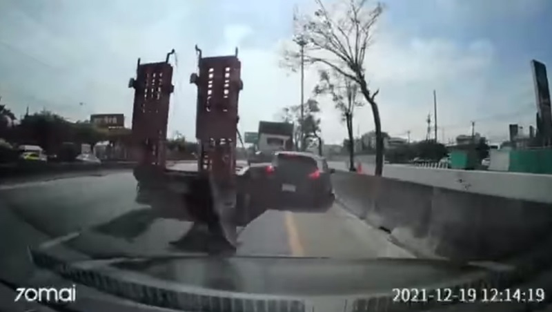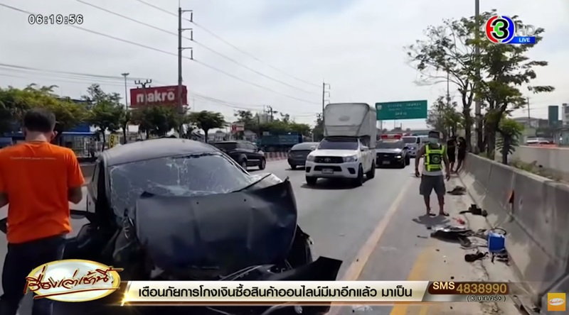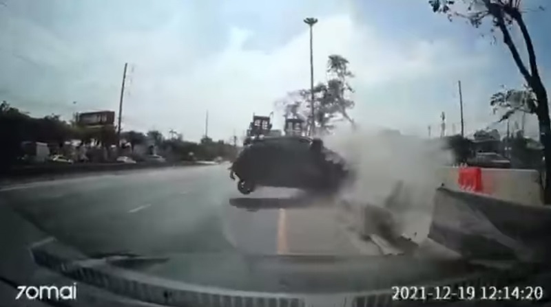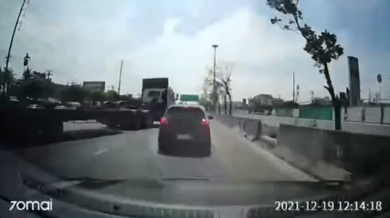 กลายเป็นภาพอุบัติเหตุสุดระทึก กรณีภาพจากกล้องหน้ารถคันหนึ่งจับภาพวินาทีที่รถบรรทุกพ่วง 22 ล้อ จู่ ๆ เกิดเสียหลัก หักเลี้ยวจากเลนซ้ายสุดมาที่เลนขวาอย่างกะทันหัน บริเวณพ่วงจึงส่ายมาฟาดรถเก๋งสีดำเต็มแรง จนรถถูกซัดไปกระแทกกับแบริเออร์ เหตุเกิดบนถนนกาญจนาภิเษก มุ่งหน้าพระราม 2