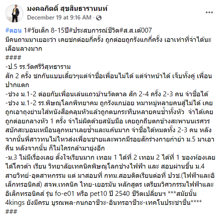กระแสหนังสะท้อนสังคมเรื่อง 4KINGS กำลังมาแรง เต้ มงคลกิตติ์ หัวหน้าพรรคไทยศรีวิไลย์ เลยขอตามเทรนด์สักหน่อย ย้อนวันวานเล่าเรื่องราววีรกรรมสมัยเด็ก ที่เคยไปชกต่อยตัวต่อตัวกับเพื่อนตั้งแต่ ป.5 และยังเคยถูกรังแกบ่อยในช่วง ม.1-ม.2 ก่อนจะเติบโตเป็นเด็กช่างสุดแข็งแกร่ง เผยตอนเป็นหนุ่มวิศวะได้เป็นประธานชมรมเพาะกายติดต่อกัน 5 ปี พร้อมอวดรูปสมัยเด็ก ๆ จนถึงตอนเรียนวิศวะ งานนี้ชาวเน็ตพากันคอมเมนต์-แซวกันถล่มทลาย เฟซบุ๊กแทบแตก