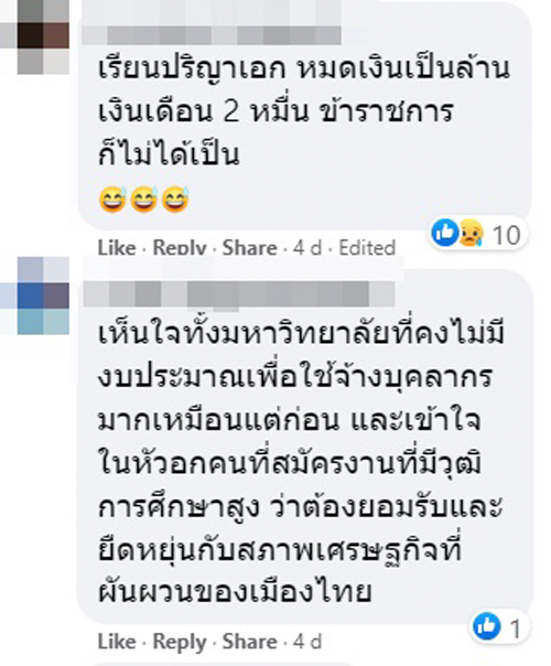 อย่างไรก็ตาม ก็มีอีกมุมหนึ่งที่เห็นใจมหาวิทยาลัย มองว่า คงไม่มีงบประมาณจ้างบุคลากรจริง ๆ เงินเดือนจึงเหลือเพียงเท่านี้ ซึ่งคนสมัครต้องปรับตัว