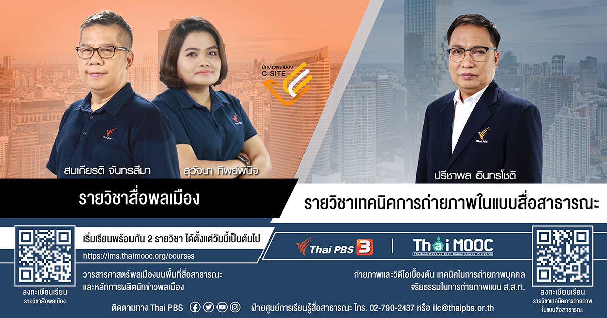 Thai PBS MOOC ได้รับการตอบรับเป็นอย่างดี หลังเปิดให้ประชาชนทั่วไปได้เข้าเรียนรู้เกี่ยวกับเรื่องสื่อสาธารณะ ในรายวิชาจริยธรรมและวิชาชีพสื่อมวลชน เราจึงภูมิใจที่จะเปิดพื้นที่การเรียนรู้เรื่องสื่อสาธารณะเพิ่มอีก 2 รายวิชา ประกอบด้วย รายวิชาสื่อพลเมือง และรายวิชาเทคนิคการถ่ายภาพในแบบสื่อสาธารณะ เพื่อให้เข้าถึงความเป็นสื่อสาธารณะมากขึ้น โดยผู้มีประสบการณ์โดยตรงจากไทยพีบีเอสมาเป็นผู้ถ่ายทอดความรู้ ทุกคนสามารถเริ่มเรียนได้แล้ววันนี้ ลงทะเบียนเรียนได้ที่