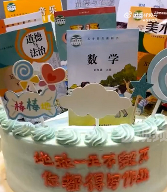 จากนั้นต่อมา คุณแม่เห็นว่าลูกชายแสนขี้เกียจ ไม่ยอมขยันตั้งใจเรียนและทำการบ้าน จึงตัดสินใจเปลี่ยนใจในนาทีสุดท้าย ไม่ได้ยกเลิกสั่งเค้กให้ แต่เปลี่ยนแบบให้ใหม่ จากเค้กตัวการ์ตูนตัวโปรด กลายเป็นเค้กหนังสือเรียน วางตั้งโดดเด่นเป็นสง่าหลายเล่มด้วยกัน
