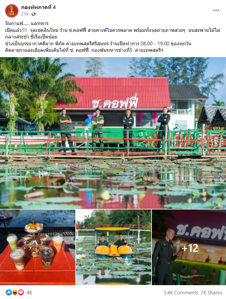 คนแชร์สนั่นพร้อมวิจารณ์กันพรึ่บ หลังกองทัพภาค 4 โปรโมต ช.คอฟฟี่ คาเฟ่ในค่ายทหาร พร้อมจุดเช็กอินถ่ายรูป แถมเปิดทุกวันให้คนทั่วไปเข้ามาใช้บริการ คนวิจารณ์ หน้าที่ทหารไม่ใช่การชงกาแฟ