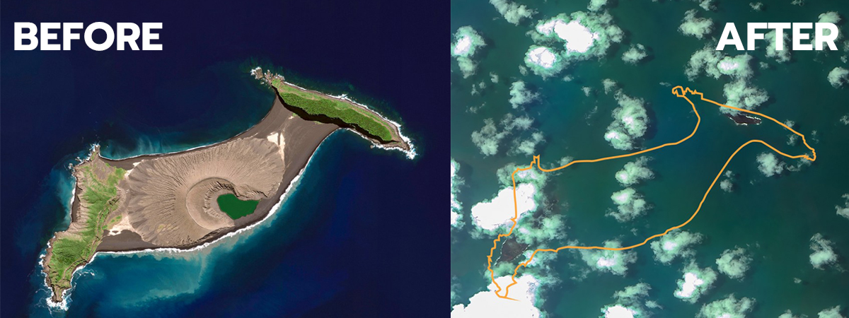 เผยภาพเทียบ Before-After ก่อนและหลังเกิดเหตุภูเขาไฟระเบิดใต้ทะเลในตองกา ทำเกาะฮังกา-ฮายาไป หายสาบสูญ
