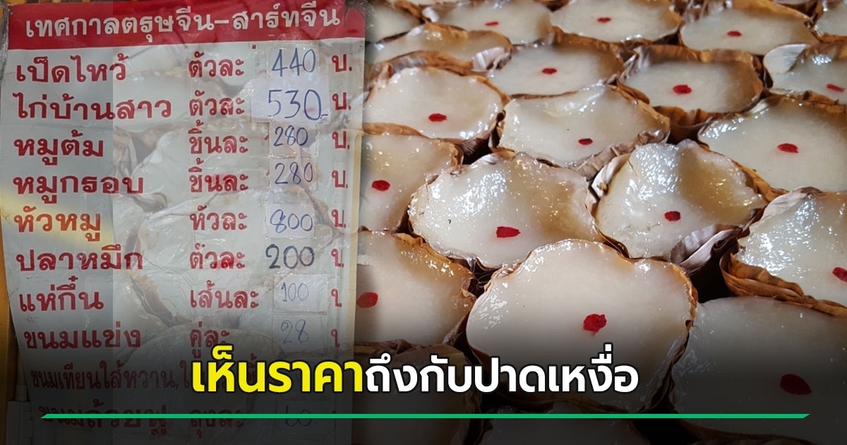เปิดราคาของไหว้เทศกาลตรุษจีน เป็ดตัวละ 440 บาท ไก่ 530 บาท หมูต้ม 280 บาท ขณะที่ราคาหัวหมูอยู่ที่ 800 บาท พีคสุดตรงขนมเข่ง ขายคู่ละ 28 บาท