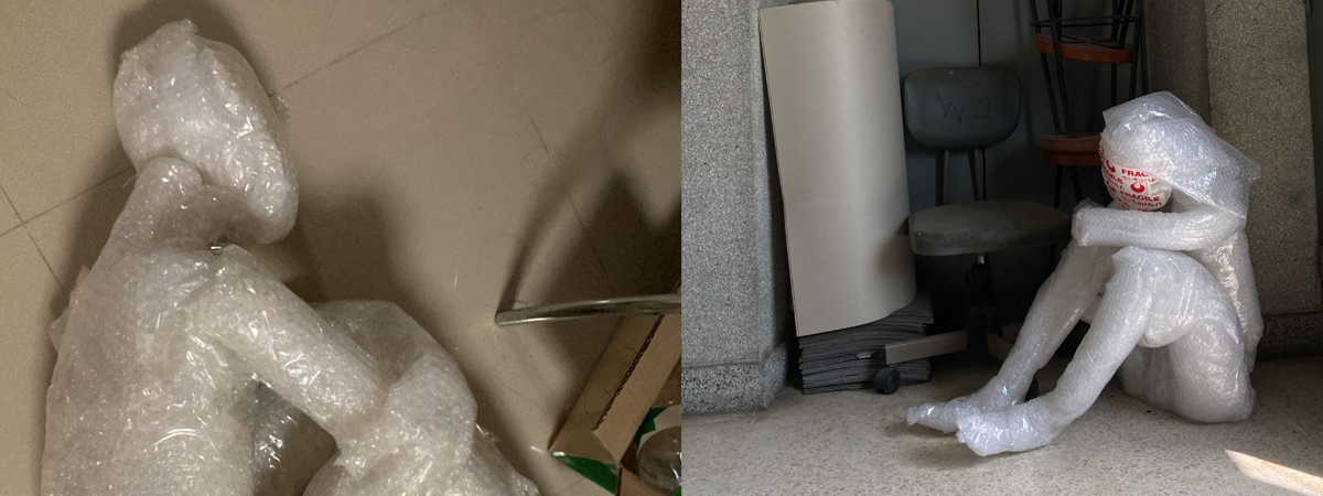 ทวิตเตอร์ @Roseria_RYSKI ได้เผยผลงานศิลปะสำหรับวิชาดีไซน์ มาในหัวข้อ Form & Space Concept โดยเลือกเอาบับเบิลห่อของที่เหลือใช้ ห่อเป็นหุ่นขนาดเท่าตัวจริง เพื่อเปรียบเสมือนเป็นการห่อหุ้มส่วนที่เป็นวิญญาณของเราไว้ คอนเซปต์ดีและสื่อออกมาค่อนข้างทัชใจ จนกลายเป็นไวรัลดังในตอนนี้