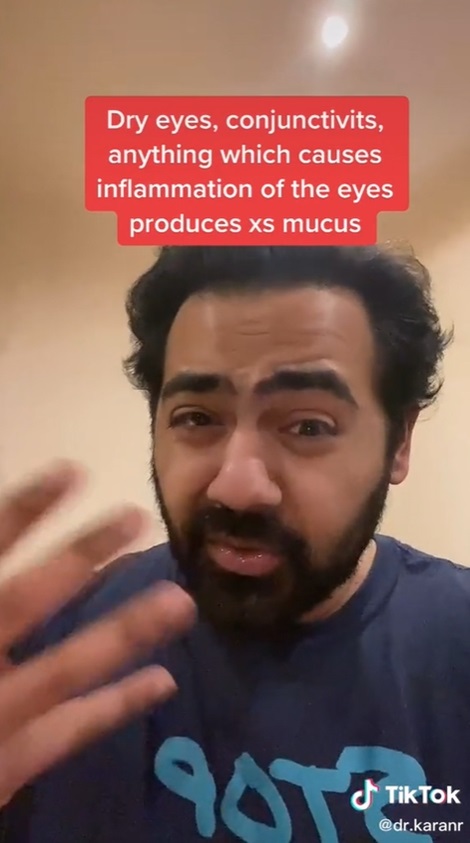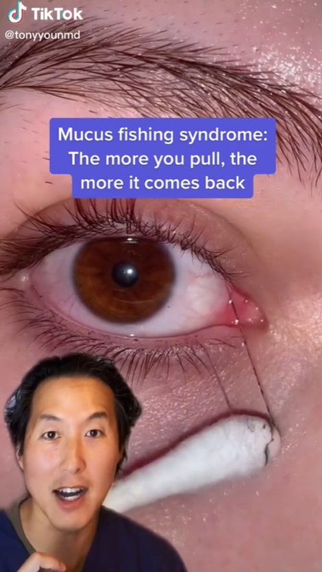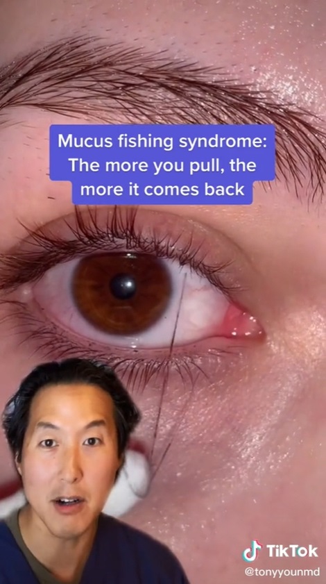 ดร.แอนโธนี ยุน ซึ่งมีผู้ติดตาม 7.5 ล้านบน TikTok กล่าวว่า พฤติกรรมดังกล่าวจัดอยู่ในกลุ่มอาการผิดปกติที่เรียกว่า Mucus Fishing syndrome ซึ่งยิ่งเขี่ยเมือก ๆ เหล่านี้ออกจากตามากเท่าไหร่ มันก็จะยิ่งมีมากขึ้น และสีดำที่เห็นก็เป็นเพราะมาสคาร่า ไม่ใช่เส้นขนใด ๆ