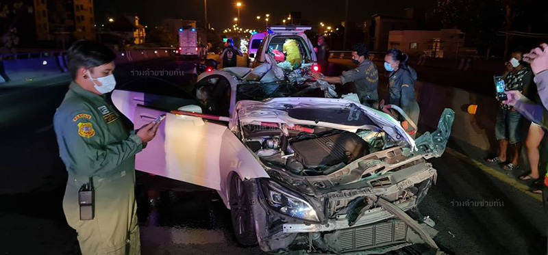 สาวขับเบนซ์เสยท้ายรถ 6 ล้อ บนสะพานข้ามแยกเอกมัยเหนือ บาดเจ็บจากแรงกระแทก พบเป็นอดีตสาวงามผู้เข้าประกวดมิสยูนิเวิร์สไทยแลนด์ 2015 ขณะที่หนุ่มนักธุรกิจนั่งมาด้วย เสียชีวิตคาที่
