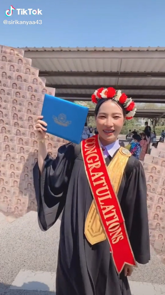 วันที่ 11 กุมภาพันธ์ 2565 โลกโซเชียลพากันฮือฮาและแห่แชร์คลิปจากผู้ใช้ TikTok @sirikanyaa43 บัณฑิตสาวป้ายแดงจากวิทยาลัยเทคโนโลยีภาคตะวันออก (อี.เทค) จ.ชลบุรี เธอแชร์ความสำเร็จและความภาคภูมิใจของเธอ ในชุดครุยวันรับใบปริญญาบัตร หลังจากตั้งใจเรียนจนจบ