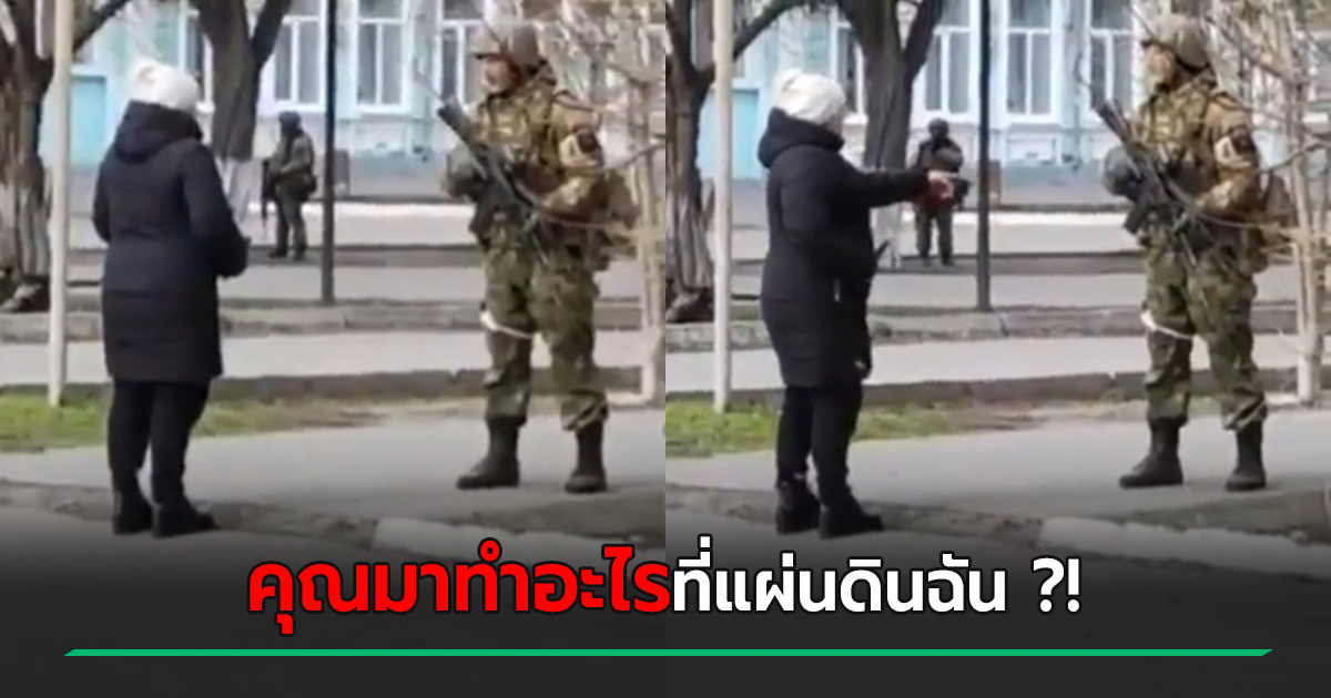 เผยนาทีหญิงยูเครนใจกล้า เผชิญหน้าทหารรัสเซียติดอาวุธหนัก พูดประโยคจี้ใจแรง ให้ปลูกดอกไม้ในกระเป๋า กลายเป็นไวรัลโซเชียล