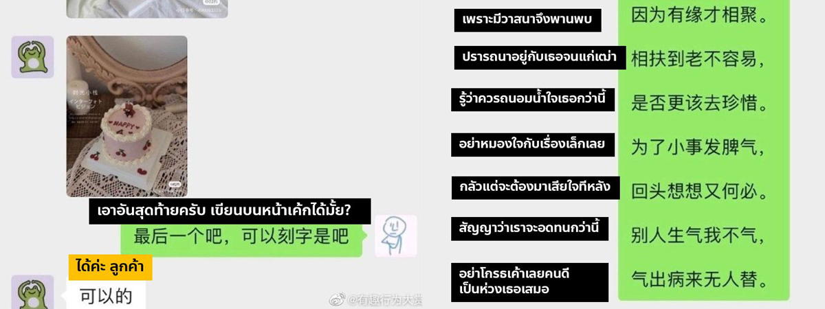 เฟซบุ๊กเพจ ลุยจีน ได้แปลภาพแชตของหนุ่มจีนคนหนึ่ง ได้ทำการสั่งเค้กสุดพิเศษเพื่อเป็นการง้อแฟน หวังแฟนกลับมาคืนดี พร้อมบอกให้เขียนข้อความบนหน้าเค้ก ผลที่ออกมานั้น ไม่ได้เป็นอย่างที่เขาต้องการ บวกกับข้อความที่ทำให้ความสัมพันธ์แฟนต้องจบลงจริง ๆ เล่นเปลี่ยนข้อความบ่อยแบบนี้ เป็นแม่ค้าก็คงปวดหัวแย่แน่ ๆ