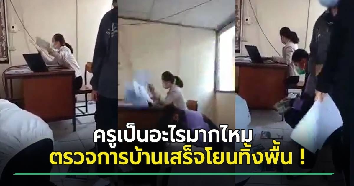 คลิปแฉครูสาวนั่งตรวจการบ้านนักเรียน ตรวจเสร็จโยนสมุดทิ้งลงพื้น ให้นักเรียนวิ่งเก็บกันเอง เด็กทนไม่ไหวต้องแอบถ่ายคลิปแฉ ชาวเน็ตด่าสนั่น เป็นอะไรมากไหมต้องทำแบบนี้ ?!
