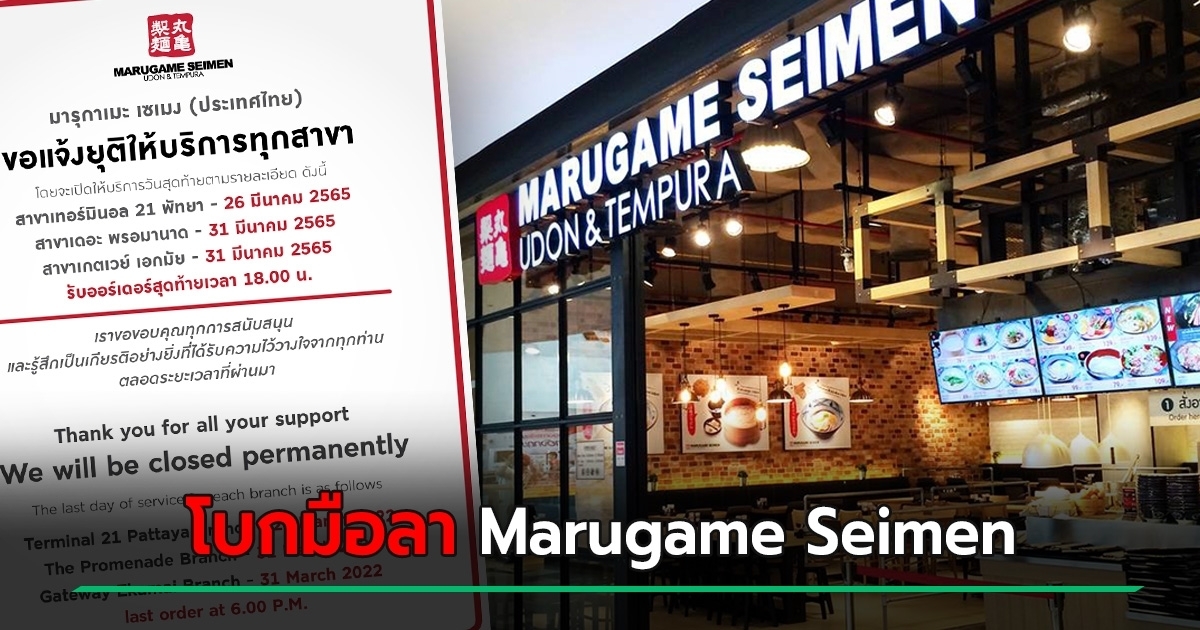 ร้านอาหารญี่ปุ่นชื่อดัง Marugame Seimen มารุกาเมะ เซเมง ประกาศยุติการให้บริการปิดทุกสาขาในประเทศไทย เปิดให้บริการวันสุดท้าย 31 มีนาคม 2565