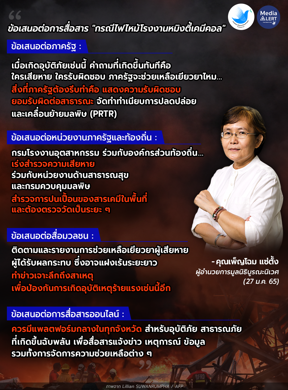 Media Alert ได้สอบถามความเห็นต่อผลการศึกษา ครั้งนี้ และขอฟังบทวิเคราะห์และข้อเสนอต่อการสื่อสารในเหตุการณ์นี้ ซึ่งเป็นอุบัติภัยร้ายแรงครั้งหนึ่งของไทย จากผู้เชี่ยวชาญที่ติดตามเรื่องแนวนี้มาโดยตลอด คือ คุณเพ็ญโฉม แซ่ตั้ง ผู้อำนวยการมูลนิธิบูรณะนิเวศ องค์กรพัฒนาเอกชนไม่แสวงผลกำไร ที่ทำงานสนับสนุนชุมชนที่ได้รับผลกระทบจากมลพิษและสารอันตราย ให้ได้รับความเป็นธรรม รวมทั้งส่งเสริมให้เกิดความยั่งยืนทางสังคมและสิ่งแวดล้อม สรุปสาระน่าสนใจจากการสัมภาษณ์ ได้ดังนี้