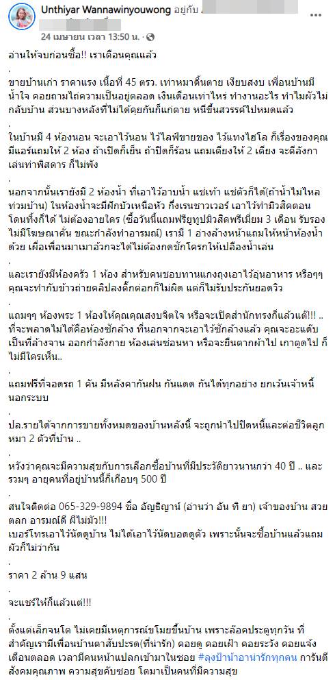 วันที่ 30 เมษายน 2565 โลกออนไลน์มีการแชร์ภาพและข้อความจาก เฟซบุ๊ก Unthiyar Wannawinyouwong ของคุณอัญธิญาน์ เจ้าของบ้านหลังหนึ่งซึ่งเธอประกาศขายบ้านหลังเก่าในราคา 2.9 ล้านบาท พร้อมบบรรยายสรรพคุณเพื่อนบ้านและฟังก์ชั่นต่าง ๆ ภายในบ้านแบบปัง แบบสับ อ่านแล้วต้องมีหลุดขำ แถมยังทิ้งท้ายว่า "เจ้าของบ้าน สวย ตลก อารมณ์ดี ผีไม่มัว !!!"
