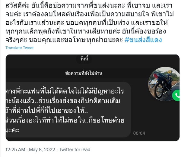 สุดท้ายเรื่องนี้ ทั้งฝ่ายนางสาวเอ และฝ่ายแฟนขนส่งก็ได้เคลียร์ใจ แฟนของขนส่งบอกว่าตอนนี้ไม่ติดใจแล้ว เรื่องส่งของก็ทำได้ตามปกติ ถ้าผ่านไปจะเอาของไปให้ อะไรที่ทำให้ไม่พอใจก็ขอโทษด้วย ซึ่งทางนางสาวเอก็ยืนยันที่จะลบโพสต์ และขอบคุณทุกคนที่เป็นห่วง พร้อมขอให้เลิกพูดถึงแฟนของขนส่งในทางเสียหายด้วย