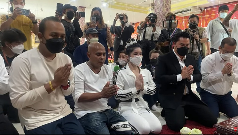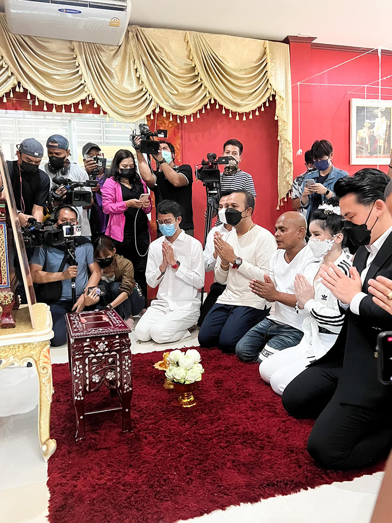 หมอปลา พร้อมด้วยน้ำฟ้าและคณะ ทำพิธีขอขมากรรมต่อหน้ารูป หลวงปู่แสง ก่อนแถลงตัดขาดช่องดัง เหตุไล่ออกนักข่าว พร้อมช่วยเยียวยาช่วงตกงาน