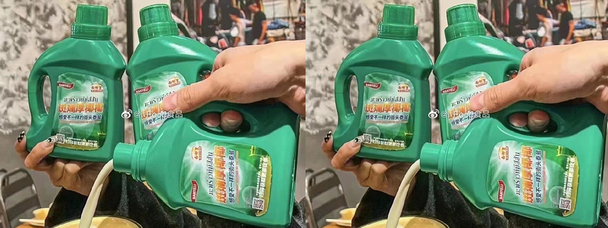 ทวิตเตอร์ @Eichan_GZ ได้เผยภาพตอนหยิบขวดน้ำยาซักผ้าเทลงไปในถ้วย งานนี้ทำเอาสงสัยกันใหญ่ว่า เทน้ำยาซักผ้าลงไปในถ้วยทำไม มองไปที่ขวดก็จะเห็นคำภาษาไทยซึ่งเป็นคำว่า มะพร้าวที่มีสีสัน ชาวเน็ตต่างถกเถียงกันว่า สรุปมันคือนมมะพร้าวหรือชานมไทยกันแน่ แต่ใด ๆ นั้น ถ้าเอาอันนี้ไปวางใกล้ ๆ กับขวดน้ำยาซักผ้าจริง ๆ คุณอาจจะหยิบผิดไปเลยก็ได้