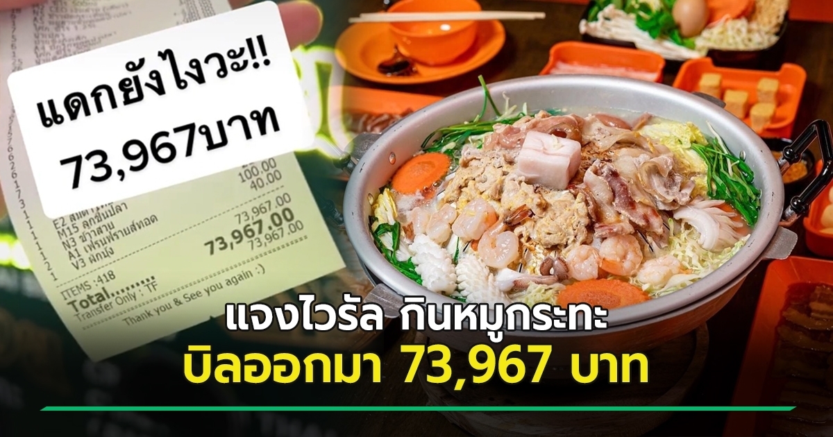 ในยุคนี้ต้องบอกว่า หมูกระทะเป็นอาหารอีกแบบที่คนไทยชื่นชอบกันทุกเพศทุกวัย ด้วยราคาที่ไม่แพงมากและมีอาหารให้เลือกหลากหลาย มีทั้งแบบตามข้างทางหรือในห้างที่คัดเกรดหมูกันมาอย่างดี ซึ่งแน่นอนว่า หลายร้านก็แข่งขันกันทำโปรโมชั่น 199 บ้าง 299 บ้าง แต่ล่าสุดได้มีไวรัลออกมา เมื่อมีคนหนึ่งไปกินหมูกระทะ และเช็กบิลออกมาที่ 73,967