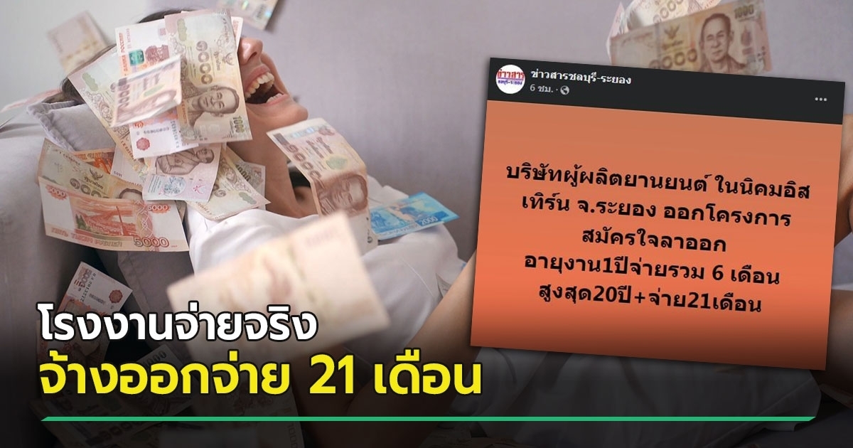 โดยรายละเอียดระบุว่า บริษัทผลิตยานยนต์ ในนิคมอีสเทิร์นซีบอร์ด จ.ระยอง ออกโครงการสมัครใจลาออก เริ่มต้นอายุงาน 1 ปี จ่ายรวม 6 เดือน จนถึงอายุงานสูงสุด 20 ปี จ่าย 21 เดือน
