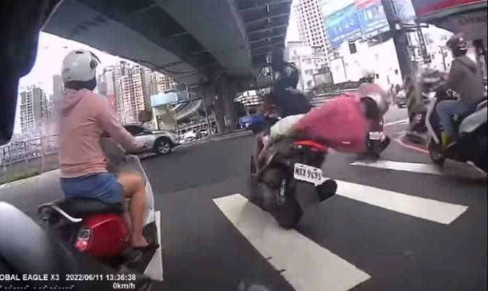 เหตุการณ์นี้เกิดขึ้นเมื่อวันที่ 11 มิถุนายน ที่ผ่านมา เมื่อเวลาประมาณ 13.35 น. บนถนนในเขตซินจู๋ ของไต้หวัน ซึ่งจากภาพจะพาว่าในจังหวะที่มอเตอร์ไซค์คันนี้หักเลี้ยวไปด้านขวา หญิงที่ซ้อนท้ายอยู่ก็ถูกเหวี่ยงไปมา แม้จะยังใช้มือเกาะรถไว้ได้ แต่ในที่สุดเธอก็หงายหลัง มีเพียงขาที่เกี่ยวรถไว้ ก่อนจะร่วงลงพื้นไป