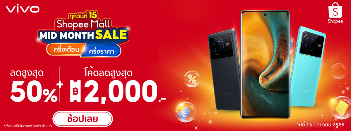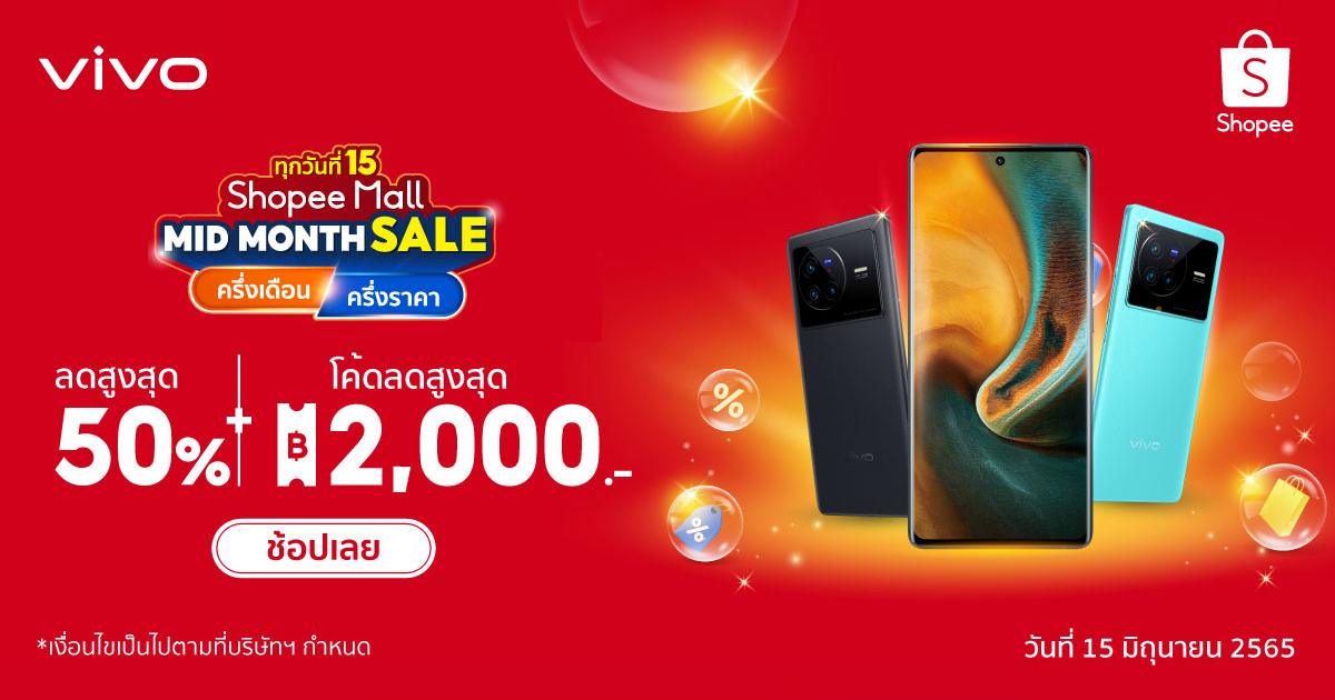วันที่ 14 มิถุนายน 2565 vivo ร่วมกับ Shopee ผู้นำแพลตฟอร์มอีคอมเมิร์ซจัดโปรโมชั่นกลางเดือนแจกโปรแรง ๆ หั่นครึ่งราคาสินค้า vivo ราคาให้สายช้อปได้ช้อปมันส์กว่าที่เคย พร้อมแจกโค้ดส่วนลดร่วมกับ Shopee รวมแล้วสูงสุดถึง 2,000 บาท เฉพาะวันที่ 15 มิถุนายน 2565 ที่ vivo Thailand Official Store บน Shopee เท่านั้น