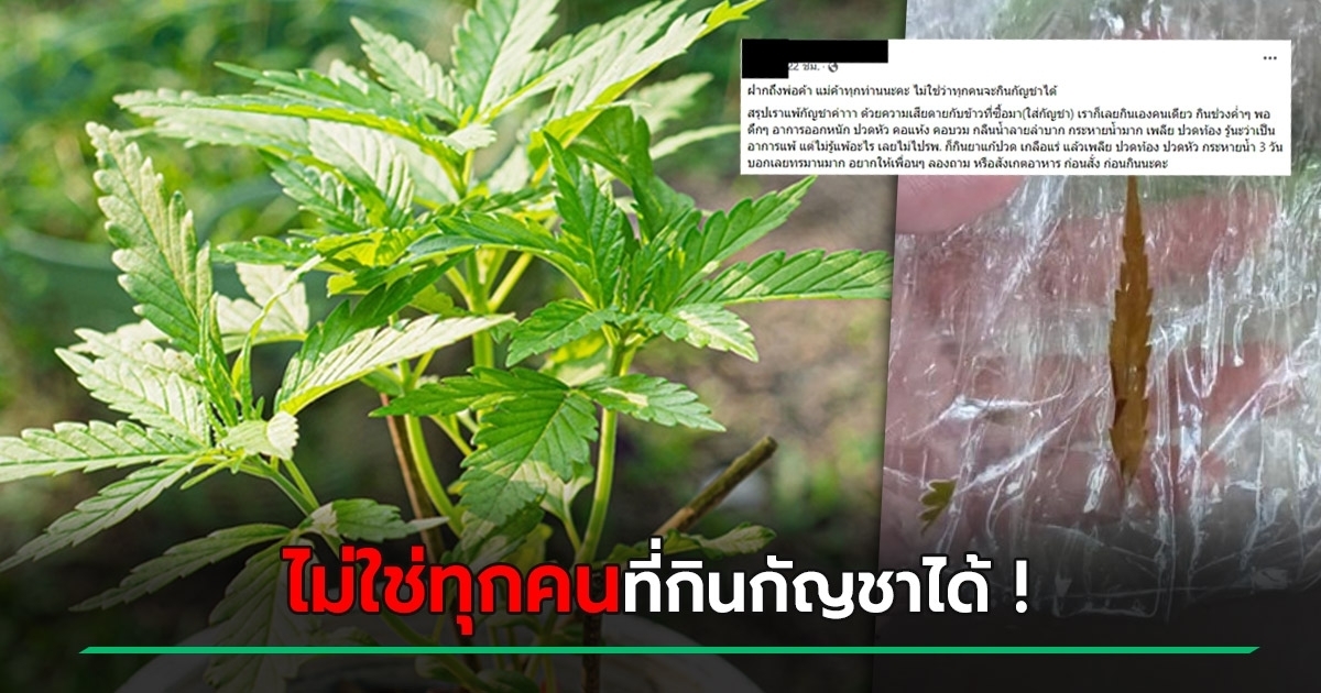วันที่ 14 มิถุนายน 2565 ผู้ใช้เฟซบุ๊กรายหนึ่ง ได้มีการโพสต์ข้อความแชร์ประสบการณ์แพ้กัญชาว่า "ฝากถึงพ่อค้า แม่ค้าทุกท่านนะคะ ไม่ใช่ว่าทุกคนจะกินกัญชาได้ สรุปเราแพ้กัญชาค่าาา ด้วยความเสียดายกับข้าวที่ซื้อมา (ใส่กัญชา) เราก็เลยกินเองคนเดียว กินช่วงค่ำ ๆ พอดึก ๆ อาการออกหนัก ปวดหัว คอแห้ง คอบวม กลืนน้ำลายลำบาก กระหายน้ำมาก เพลีย ปวดท้อง รู้นะว่าเป็นอาการแพ้ แต่ไม่รู้แพ้อะไร เลยไม่ไปโรงพยาบาลก็กินยาแก้ปวด เกลือแร่ แล้วเพลีย ปวดท้อง ปวดหัว กระหายน้ำ 3 วัน บอกเลยทรมานมาก อยากให้เพื่อน ๆ ลองถาม หรือสังเกตอาหาร ก่อนสั่ง ก่อนกินนะคะ"