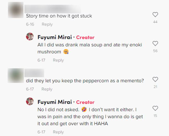 อย่างไรก็ตาม สำหรับคนที่สงสัยว่าเธอคิดจะเก็บพริกเสฉวนเจ้าปัญหานั้นมาเป็นที่ระลึกไหม หญิงสาวปฏิเสธทันที บอกเลยว่าไม่ได้ขอหมอเก็บไว้ แล้วก็ไม่ได้อยากจะได้ด้วย เธอเจ็บปวดมากตอนนั้นและสิ่งเดียวที่อยากทำก็คือเอามันออกมา