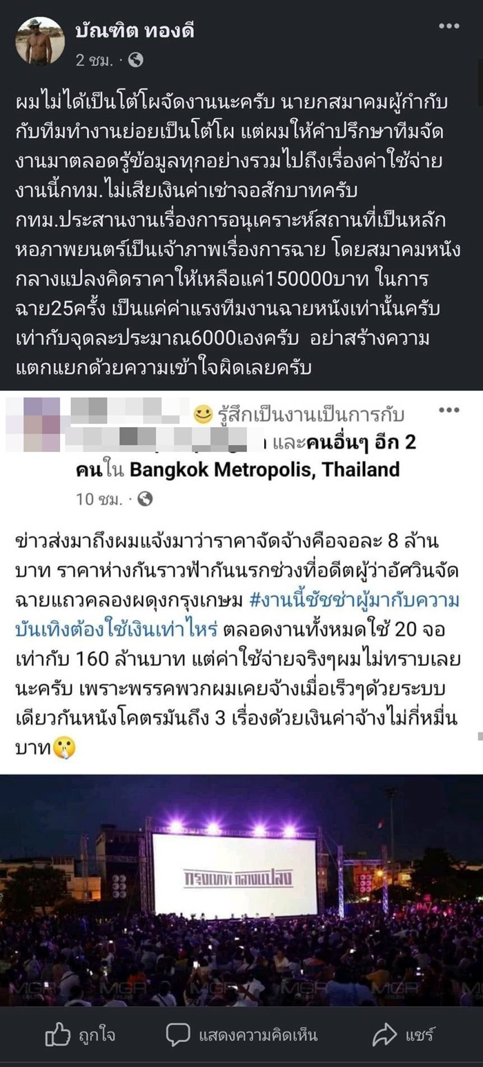 กรุงเทพ กลางแปลง เจอดราม่า คนโพสต์แฉจอละ 8 ล้าน รวมทะลุ 160 ล้าน ด้านผู้กำกับดังชี้แจง กทม. ไม่เสียเงินเช่าจอสักบาท พร้อมอธิบายทำได้อย่างไร วอนอย่าสร้างความแตกแยก