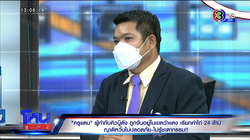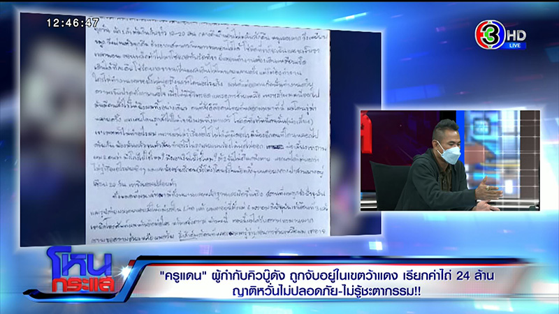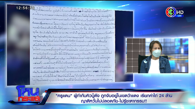 จากกรณีที่ผู้กำกับคิวบู๊นักแสดง นายระม้าย โมริพันธ์ หรือ ครูแดน ถูกจับตัวไปประเทศเพื่อนบ้าน มีการเรียกเงินค่าไถ่ 24 ล้าน เพื่อให้ปล่อยตัวกลับมา ด้านครอบครัวครูแดนเดินทางไปร้อง ผบ.ตร. สำนักงานตำรวจแห่งชาติ ขอให้ช่วยเหลือ รายการ โหนกระแส วันที่ 11 กรกฎาคม 2565 สัมภาษณ์ คำ โมริพันธ์ แม่ครูแดน, จ่าบอยเจบี เพื่อนสนิทครูแดน มาพร้อม สุวรรณ บัวโรย เลขานุการกรรมาธิการแรงงาน