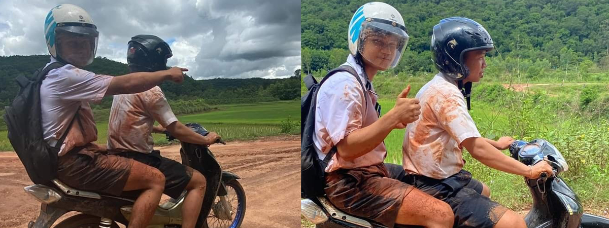 นักเรียนขี่มอเตอร์ไซค์ลุยโคลนไปโรงเรียน ชุดเลอะทั้งตัว วอนหน่วยงานเร่งแก้ไขถนน