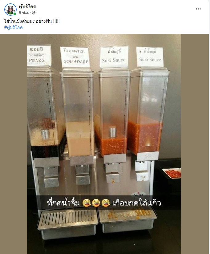 หากพูดถึงร้านบุฟเฟ่ต์ก็จะนึกถึงจุดตักอาหารที่วางเอาไว้ ซึ่งทุกที่ก็จะมีน้ำจิ้มวางไว้ใกล้ ๆ กัน ส่วนมากภาชนะที่ใช้จะเป็นถ้วยหรือหม้อขนาดใหญ่ แต่บอกเลยว่าไม่ใช่ร้านนี้ โดยล่าสุด (14 กรกฎาคม 2565) เพจเฟซบุ๊ก ผู้บริโภค ได้มีการเผยภาพที่กดน้ำจิ้มของร้านบุฟเฟ่ต์ร้านหนึ่ง ซึ่งเอาน้ำจิ้มใส่ในที่กดเหมือนกับที่กดน้ำยังไงยังงั้น